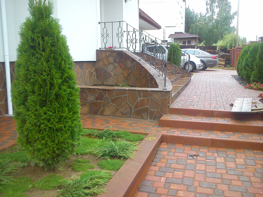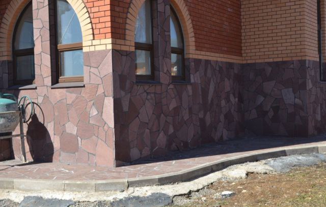 Песчаником можно облицевать цоколь, весь фасад или же его отдельные участки. А в поддержку общему стилю – можно облицевать им забор или создать подпорную стенку.