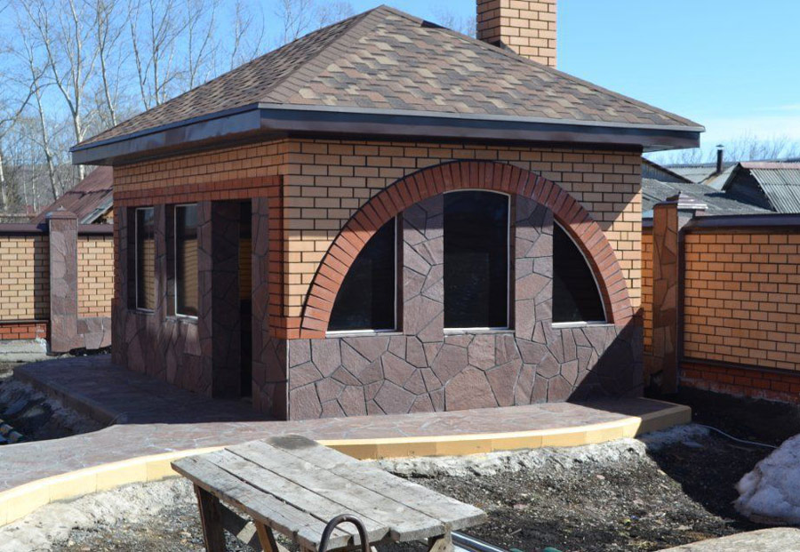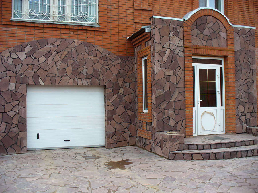 Песчаником можно облицевать цоколь, весь фасад или же его отдельные участки. А в поддержку общему стилю – можно облицевать им забор или создать подпорную стенку.